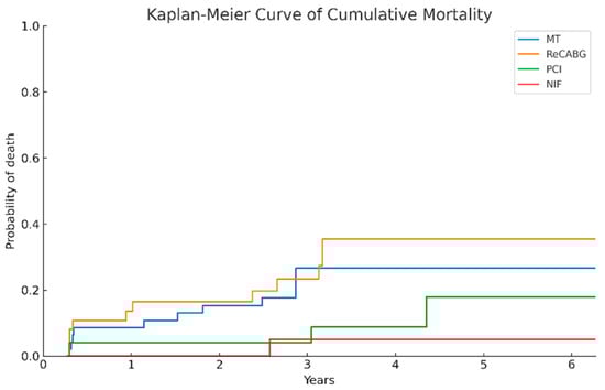 The Kaplan–Meier curve illustrate the probability of mortality over time for the four patient groups. Abbreviations: MT, medical therapy; ReCABG, redo coronary artery bypass grafting; PCI, percutaneous coronary interventions; NIF, no identified findings in the repeat coronary angiography.