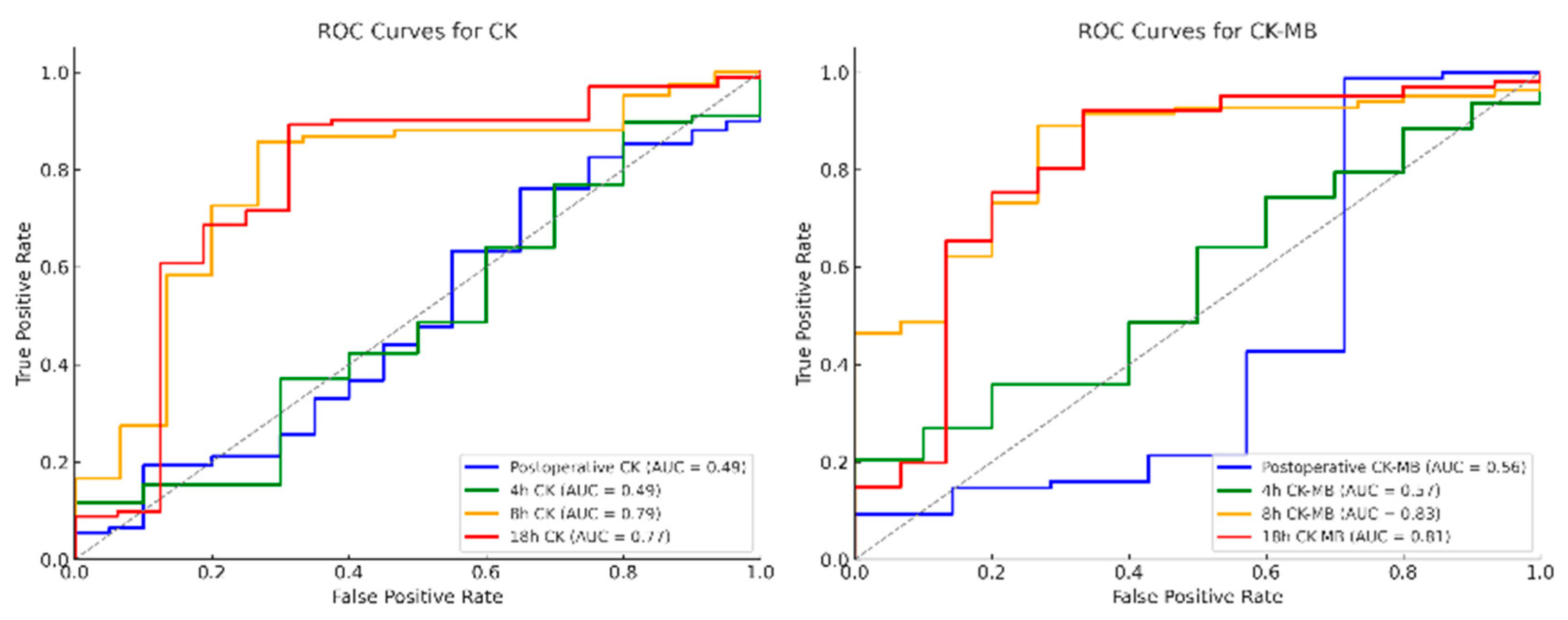 3.8. Receiver Operating Characteristic (ROC) Analysis of Postoperative Enzyme Course of CK, CK-MB and CK/CK-MB Ratio