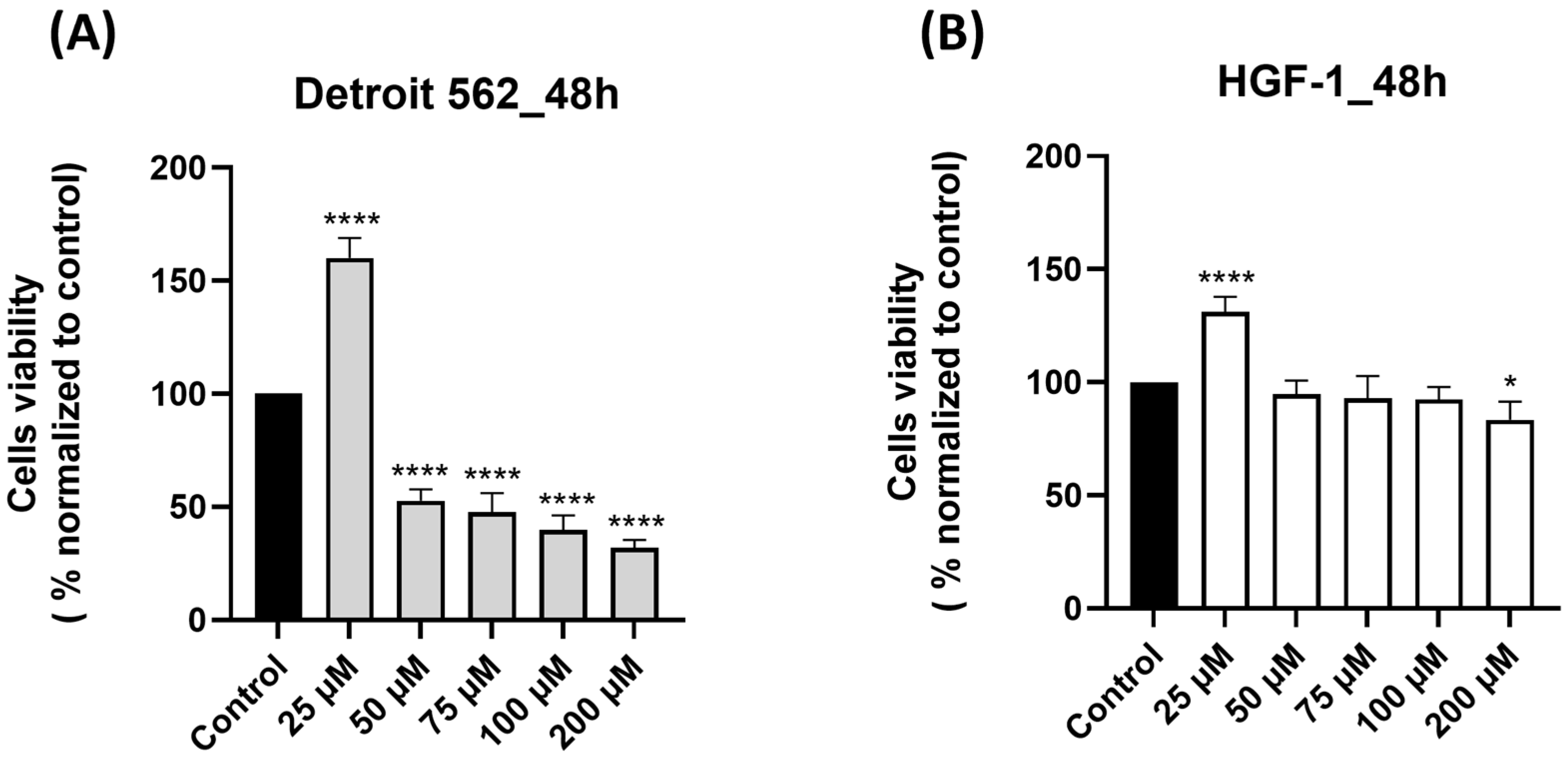 3.1. SIL Triggered a Cell-Type Dependent Cytotoxicity: Potent Effects in Detroit 562 Cancer Cells Versus Minimal Toxicity in HGF-1 Healthy Gingival Fibroblasts