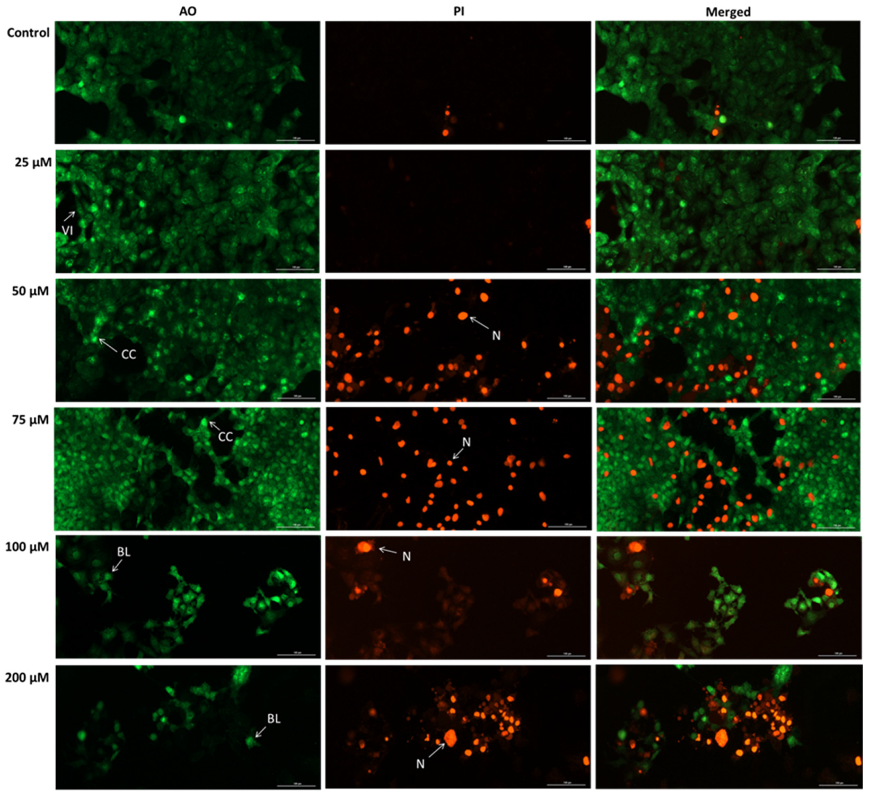2.10. Acridine Orange/Propidium Iodide (AO/PI) Assay