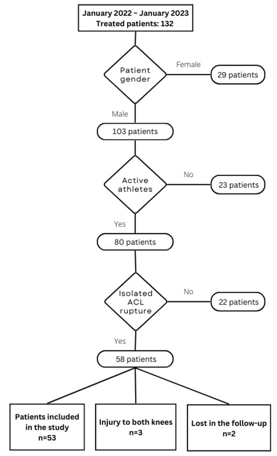 This study was initially designed and conducted as a single-center pilot cohort study at a time when prospective registration in ClinicalTrials.gov was not required by our institutional policies or local regulations for this type of investigation. As a result, the trial was registered retrospectively at ClinicalTrials.gov (NCT07257666; registration completed on 2 December 2025, after patient enrollment and primary data collection had been completed. The research was designed as a pilot cohort study and was conducted at the XXBLINDEDXX. It received approval from the Ethics Committee University Clinical Centre of Serbia under reference number 578/5, and Ethics Committee School of Medicine University of Belgrade under reference number 17/VI-3. Between January 2022 and January 2023, ACL reconstruction using a BPTB graft was performed on 53 patients who met all inclusion criteria by one orthopedic surgeon and an identical surgical team. The inclusion criteria were: male patients actively participating in sports, isolated ACL rupture, as well as intact sensation in the anterior knee. Exclusion criteria were: failure to attend follow-up appointments, previous surgery on the same or contralateral knee, or meniscal or cartilage injuries. All patients signed informed consent forms after being thoroughly briefed on the study’s objectives and potential effects. The patient selection process is illustrated in Chart 1. We formed two cohorts of patients: the Vivostat group (Group 1, donor site filled with autologous PRF-Vivostat A/S, Alleroed, Denmark, 24 patients) and the standard group (Group 2, donor site left unfilled, 29 patients).