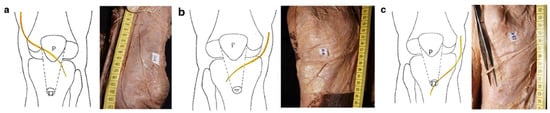 - Kalthur, S.G.; Sumalatha, S.; Nair, N.; Pandey, A.K.; Sequeria, S.; Shobha, L. Anatomic study of infrapatellar branch of saphenous nerve in male cadavers. Ir. J. Med. Sci. 2015, 184, 201–206. [Google Scholar] [CrossRef] [PubMed]