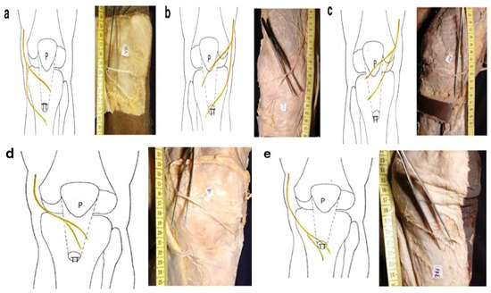 Anatomic variation in two IPBSN: (a) one branch at level of the patellar ligament, other at tibial tubercle (TT); (b) one branch at the level of patella (P) and other at tibial tubercle (TT); (c) one branch at patella and other of the patellar ligament; (d) both branches at the level of patellar ligament; (e) both branches at the level of tibial tubercle (TT) [13].