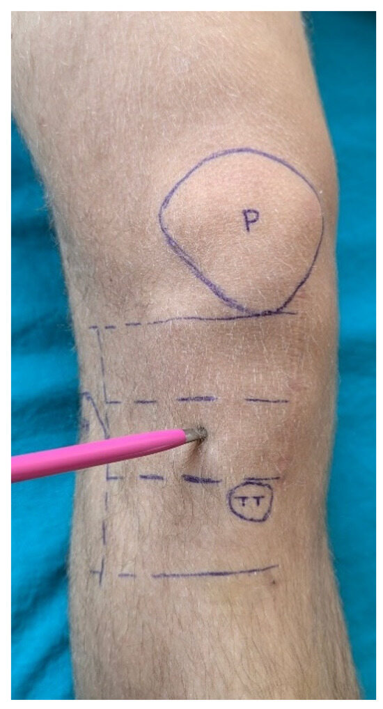 Anterior cruciate ligament (ACL) reconstruction is one of the most commonly performed surgical procedures in orthopedic surgery [1]. Despite the significant donor site morbidity associated with bone–patellar tendon–bone (BPTB) grafts, many surgeons still consider them the gold standard for graft selection [2]. Some studies suggest that the actual incidence of donor site morbidity is lower than reported in the literature [3]. BPTB graft harvesting can result in pain in the anterior knee segment, kneeling pain, and sensory deficits, with severe complications such as patellar fractures and ruptures of the patellar ligament also possible [4,5]. Sensory deficits may manifest as numbness, dysesthesia, or anesthesia, sometimes accompanied by painful neuromas and anterior knee pain [6,7]. Numbness occurs in up to 88% of patients following BPTB ACL reconstruction [8]. This deficit can persist for months or even years, and in some cases, it may become permanent. Though extremely rare, the occurrence of neurological deficits during arthroscopic meniscus or cartilage surgery has been described in the literature [9]. The cause of numbness lies in the neurological impairment of the infrapatellar branch of the saphenous nerve (IPBSN), which can occur either during surgical incision for graft harvesting or during the creation of portals for arthroscopic surgery (Figure 1).