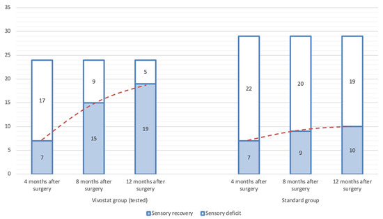 When analyzing the frequency of patients with sensory deficits across all follow-up visits, a statistically significant reduction in the incidence of sensory deficits was observed in Group 1 (defect filled with Vivostat®), whereas this trend was not observed in Group 2. To more precisely determine the postoperative period in which significant sensory recovery occurred, pairwise comparisons of sensory deficit incidence were performed between follow-up visits. The results indicate that significant sensory recovery in the Vivostat group occurs between eight and twelve months postoperatively, relative to the initial measurements at the four-month follow-up. This trend was not observed in the Standard group (Table 4). Based on these findings, it can be concluded that the most pronounced recovery in the Vivostat group takes place by the eighth month postoperatively, as no significant statistical differences were found between the eight- and twelve-month follow-ups postoperatively.
