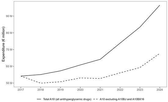 The present study therefore aimed to (i) describe national utilization and expenditure trends for antihyperglycemic drugs (ATC A10) from 2017 through to 2024; (ii) quantify growth in GLP-1 receptor agonists (A10BJ) and the dual GLP-1/GIP agonist (A10BX16), relative to insulins and their analogs (A10A) and SGLT-2 inhibitors (A10BK); and (iii) estimate their cumulative budget impact within total antihyperglycemic drug expenditure.