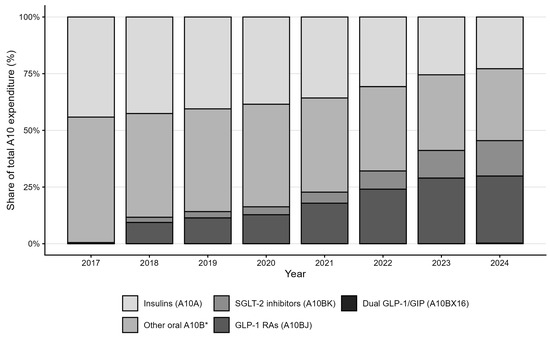 Figure 3). Insulins represented about 23% of total A10 expenditure in 2024, while SGLT-2 inhibitors accounted for 15.6%. The residual oral and combination therapies collectively declined from more than half of the total in 2017 to 31.7% in 2024. The year-by-year evolution of the expenditure share of GLP-1 RA and dual GLP-1/GIP agonist therapies is shown in