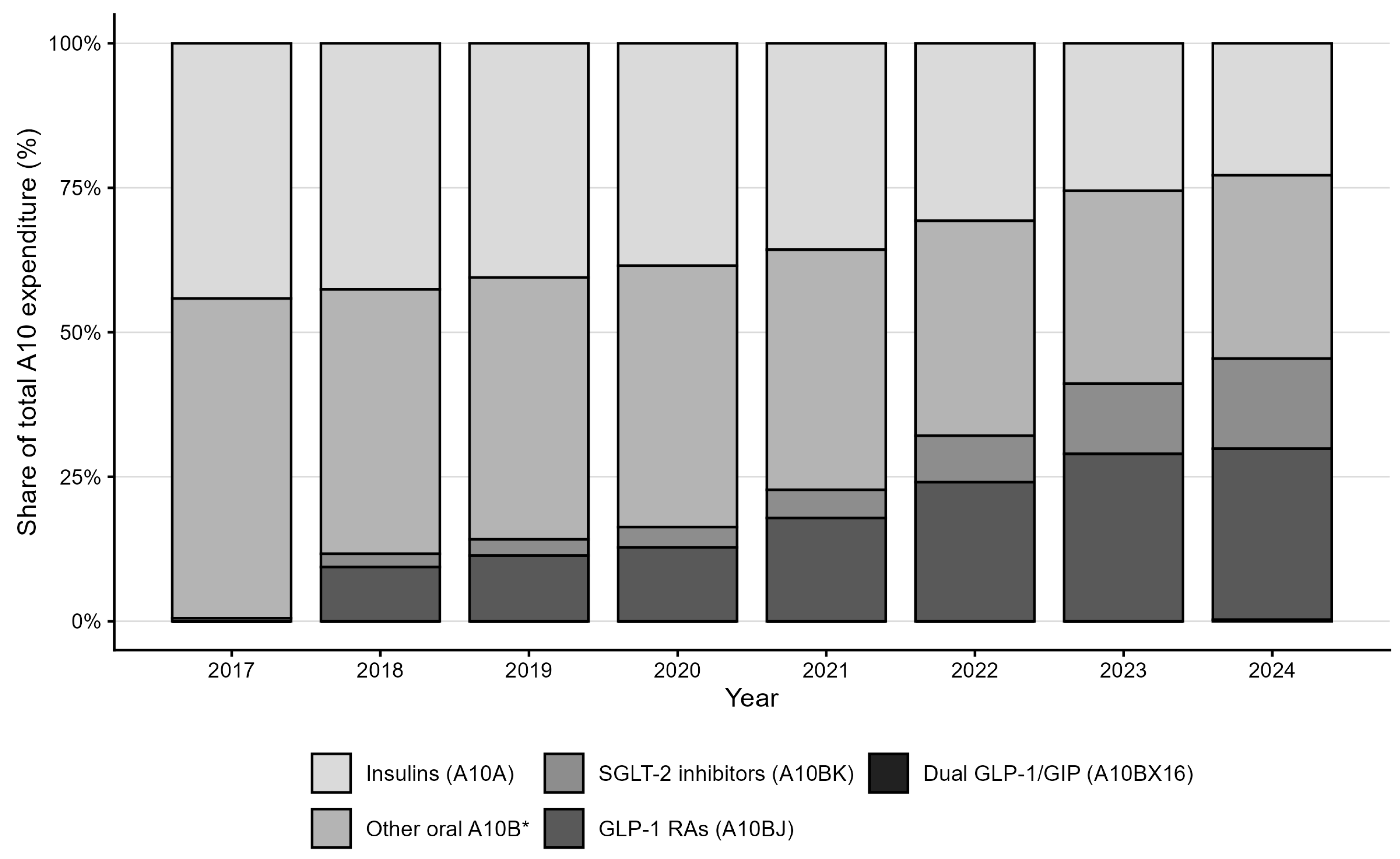 The relative share of GLP-1 RA and the dual GLP-1/GIP agonist within total antihyperglycemic drug expenditure increased from zero in 2017 to 29.8% in 2024 (