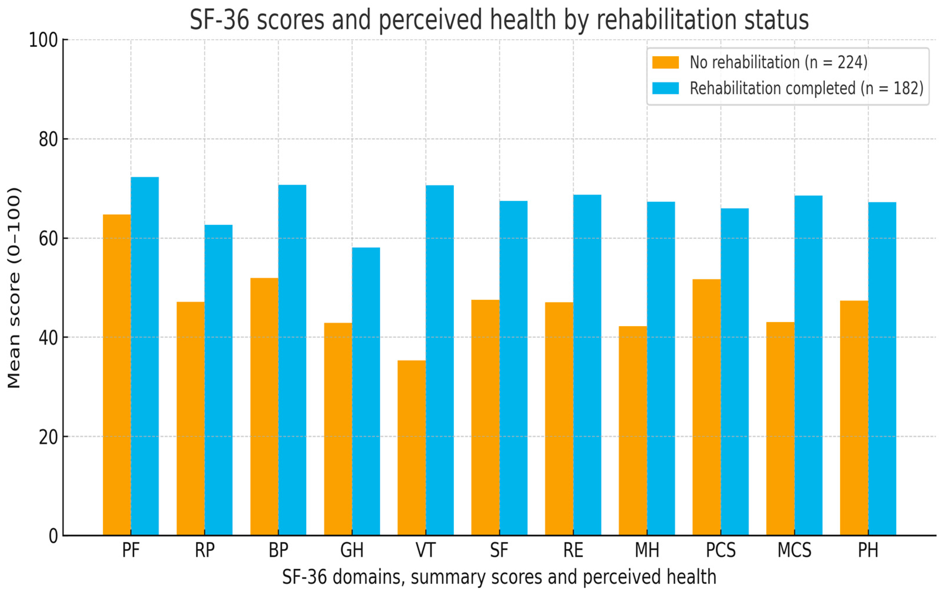 Figure 2, which shows consistently higher mean SF-36 domain and summary scores, as well as better perceived health, in respondents who completed rehabilitation compared with those who did not. The largest gaps are visible for Vitality, Mental Health and the Mental Component Summary, indicating clinically meaningful advantages in energy, mood and psychosocial functioning among participants who reported rehabilitation.