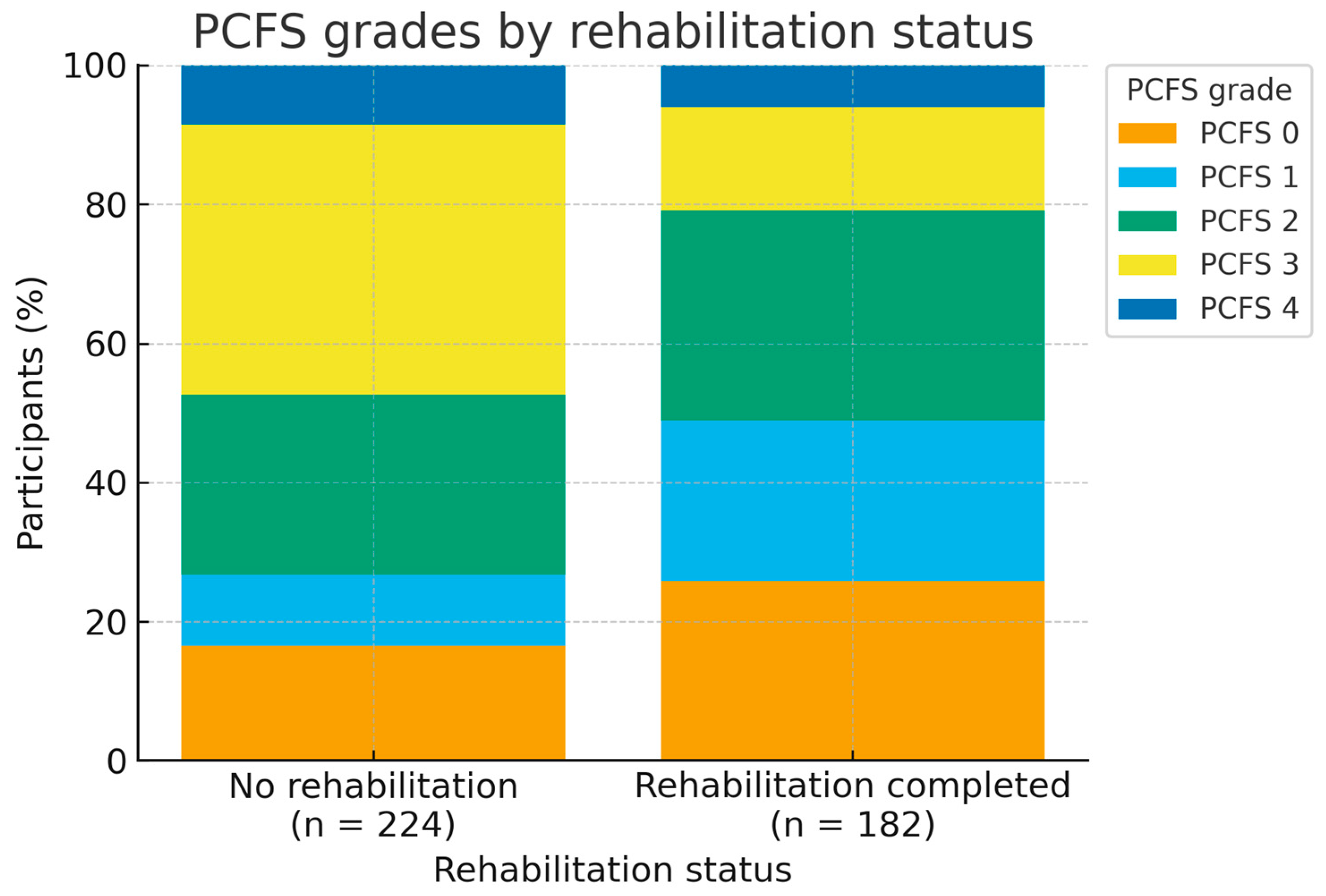 Participants were asked whether they had completed any rehabilitation programme specifically intended to address their post-COVID-19 symptoms, broadly defined to include physiotherapy-based programmes, multidisciplinary rehabilitation, or other structured interventions prescribed or supervised by health professionals. For the purposes of the present analysis, rehabilitation was coded as a binary variable (completion of any such programme: yes/no), and we did not standardise or stratify by specific modality, setting or intensity.