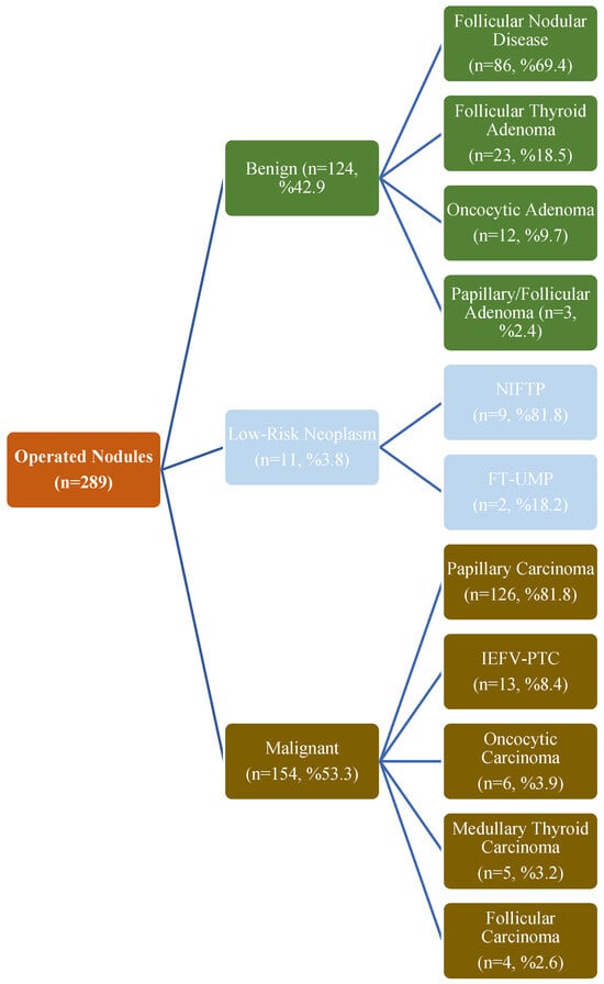 - Kılınç Uğurlu, A.; Bitkay, A.; Gürbüz, F.; Karakuş, E.; Bayram Ilıkan, G.; Damar, Ç.; Şahin, S.; Kıran, M.M.; Gülaldi, N.; Azılı, M.N.; et al. Evaluating Postoperative Outcomes and Investigating the Usefulness of EU-TIRADS Scoring in Managing Pediatric Thyroid Nodules Bethesda 3 and 4. J. Clin. Res. Pediatr. Endocrinol. 2024, 16, 160–167. [Google Scholar] [CrossRef] [PubMed]