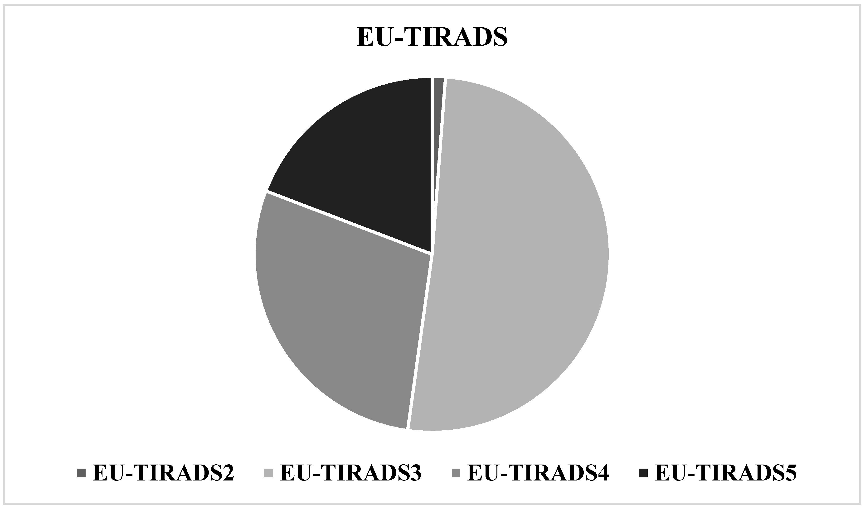 - Nabahati, M.; Moazezi, Z. Performance of European Thyroid Imaging Reporting and Data System in Stratifying Malignancy Risk of Thyroid Nodules: A Prospective Study. J. Med. Ultrasound 2023, 31, 127–132. [Google Scholar] [CrossRef]