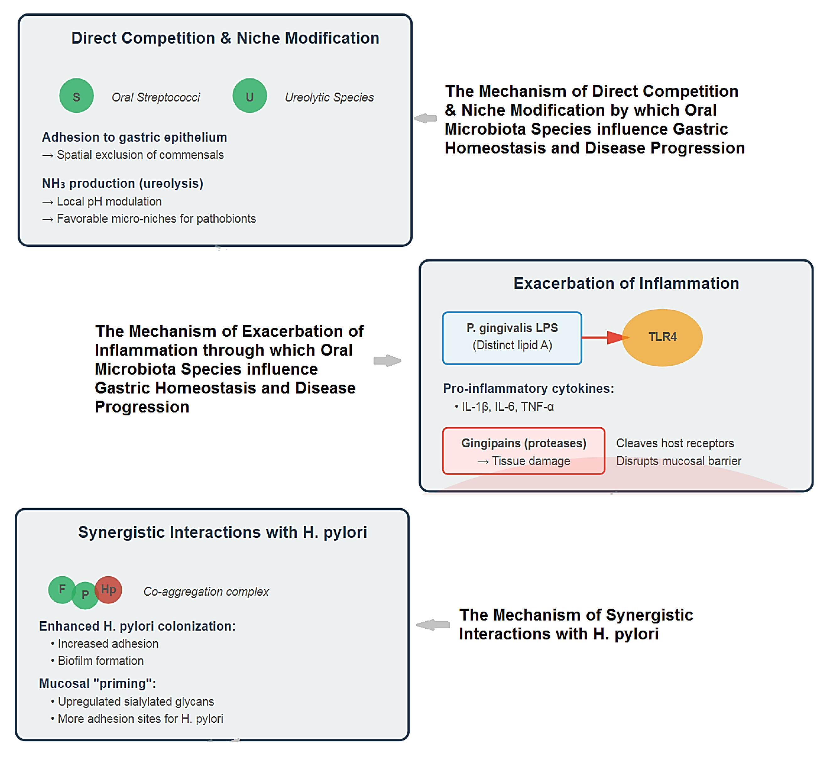 | Direct Competition and Niche Modification | Oral Streptococci: Adhesion to gastric epithelial cells. Ureolytic Species: Production of ammonia. | Competes with and excludes resident gastric commensals for space and nutrients. Locally modulates pH, creating micro-niches favorable for acid-sensitive pathobionts. |