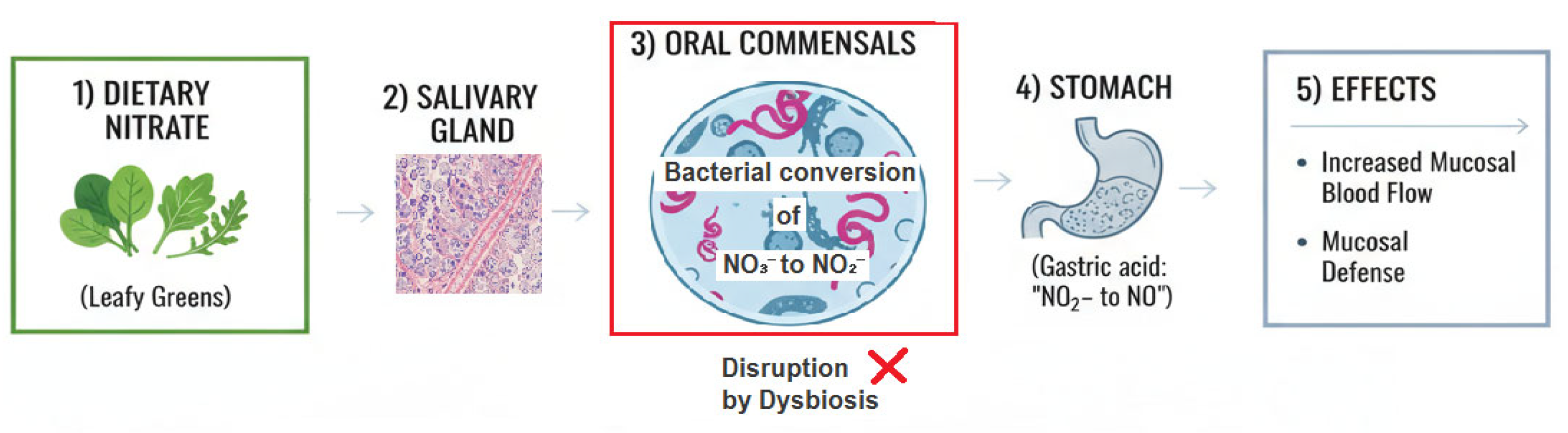 - Oral Commensals—Bacterial conversion of NO3− to NO2− by nitrate-reducing bacteria in tongue biofilm, with an “X” mark indicating disruption by dysbiosis