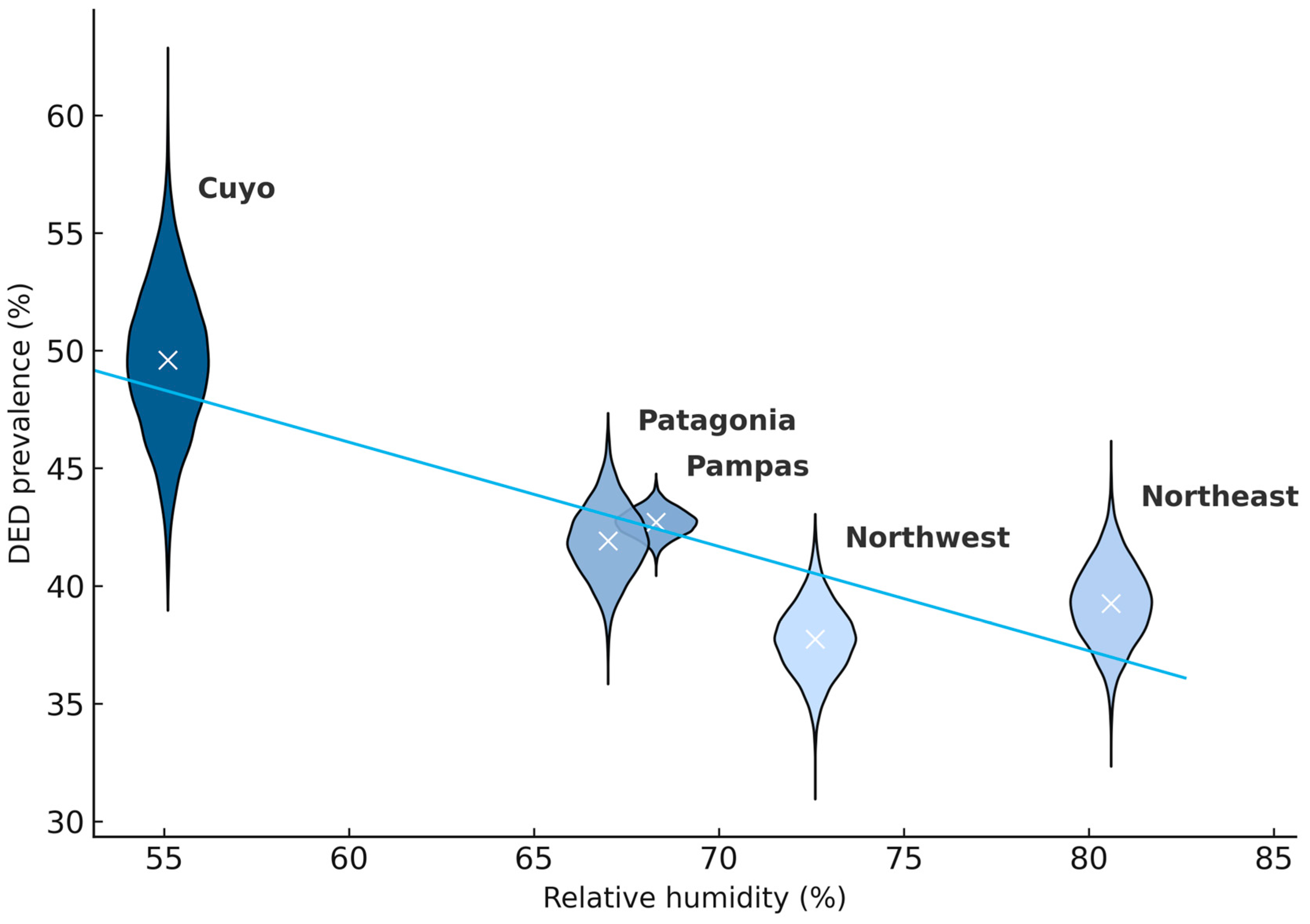 | 1 | RH (%) | −0.409 | Regions with higher RH tended to show lower DED prevalence. |