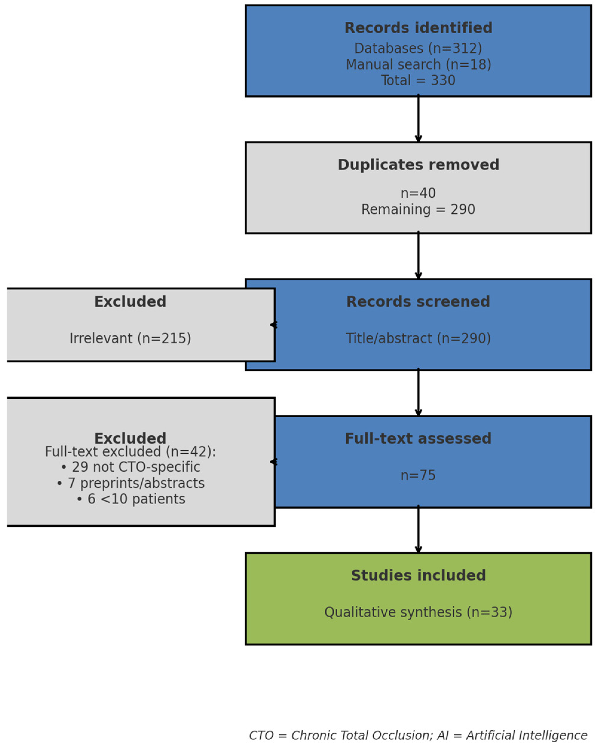 The search identified 330 records: 312 from electronic databases and 18 from manual reference screening. After removal of 40 duplicates, 290 records remained. Title and abstract screening excluded 215 as irrelevant (e.g., AI in non-coronary imaging or general CAD cohorts without CTO subgroup analysis). Of the 75 full-text articles reviewed, 42 were excluded (29 lacked CTO focus, 7 were preprints or abstracts only, 6 had sample size <10). Ultimately, 33 studies were included in the qualitative synthesis, spanning all four predefined domains. The study selection process is summarized in
