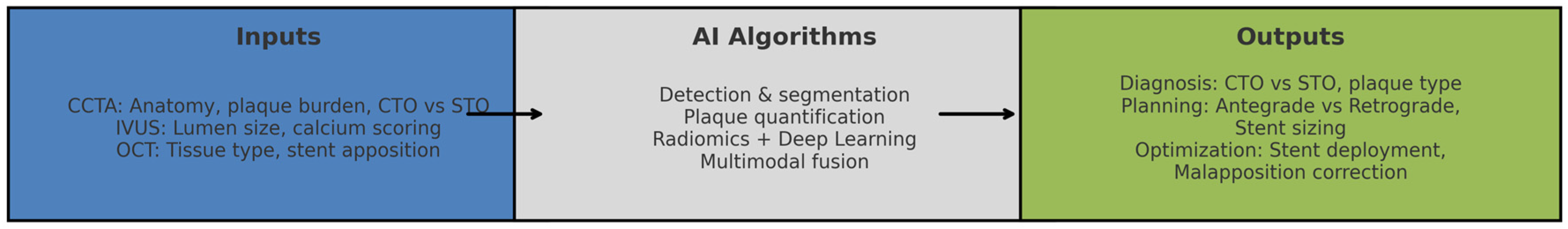 CTO PCI is uniquely suited for the application of AI for several reasons. First, CTO lesions are highly heterogeneous in morphology, requiring nuanced evaluation of proximal cap ambiguity, calcification, tortuosity, and collateral circulation. Second, multiple imaging modalities (CCTA, angiography, IVUS, OCT) are frequently used, generating vast and diverse datasets ideally suited for AI-based integration. Third, procedural strategies are variable, ranging from antegrade wire escalation to retrograde approaches and dissection-reentry techniques; AI can assist in tailoring strategy selection to individual patient anatomy and operator expertise. Fourth, procedural success and complication rates remain more variable than in non-CTO PCI, creating a substantial need for improved predictive tools. Finally, operator and institutional experience exert a strong influence on outcomes, and AI offers the potential to standardize decision-making and reduce dependence on individual expertise. Collectively, these factors render CTO PCI an “ideal test case” for the clinical integration of AI.