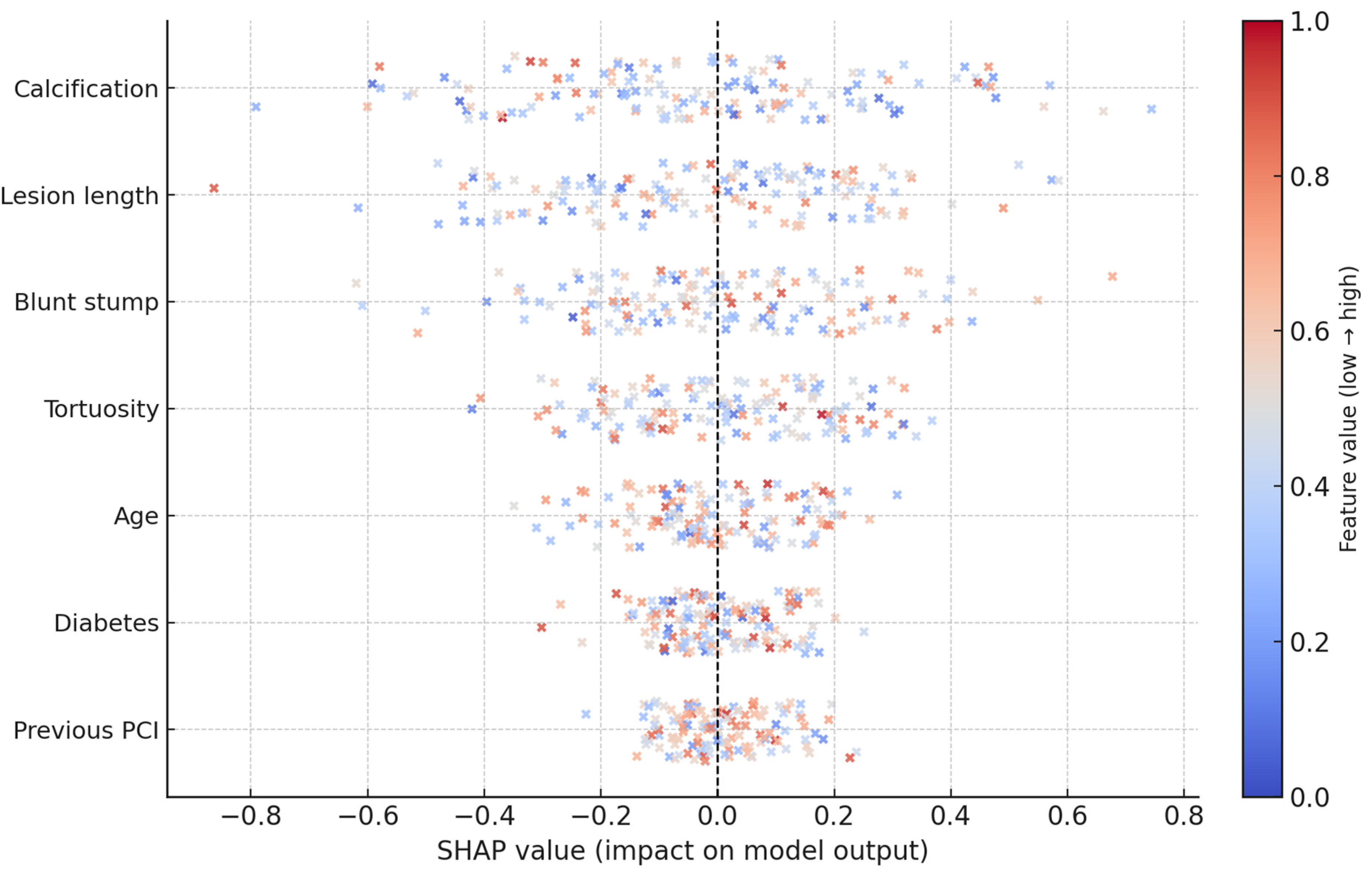Figure 5) allow visualization of individual-level risk contributions, making AI not only more accurate but also more clinically transparent in CTO cases. Similarly, the integration of multimodal data—including CCTA, IVUS, OCT, baseline LVEF, and PROMs—offers far greater incremental value in CTO PCI than in non-CTO lesions, where data heterogeneity is less pronounced.