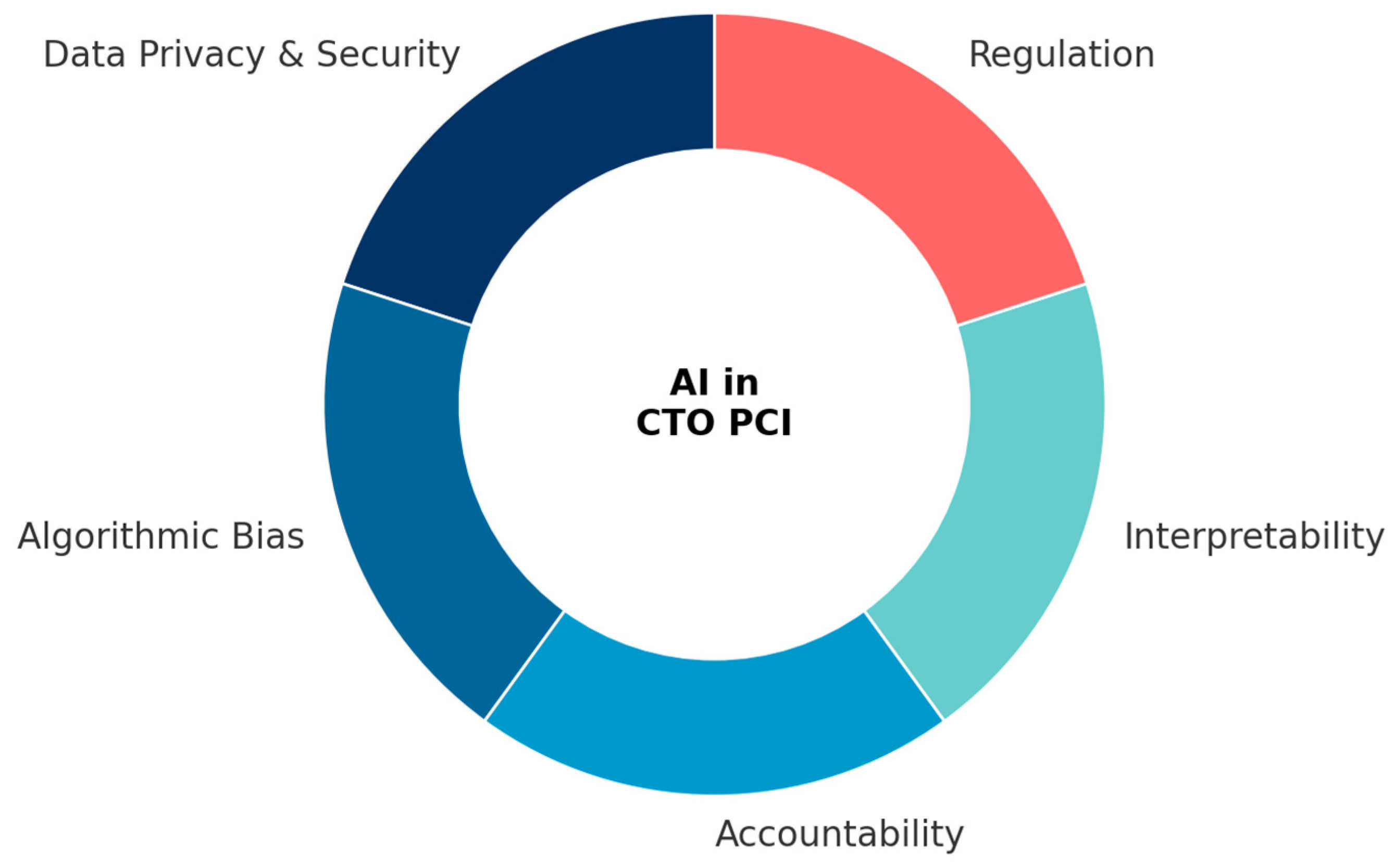 The implementation of AI in CTO PCI is hindered by several interrelated challenges. Data privacy regulations such as GDPR and HIPAA restrict unrestricted data sharing, though federated learning offers a pathway to privacy-preserving collaboration. Algorithmic bias, including population, vendor, and outcome definition biases, threatens the generalizability and equity of AI models, but can be mitigated by fairness metrics, diverse training cohorts, and external validation. Accountability remains a debated issue, particularly as AI evolves from assistive to potentially semi-autonomous roles. Interpretability is essential for clinical trust, and XAI techniques such as SHAP, LIME, and Grad-CAM represent important advances. Finally, regulatory frameworks from the FDA and EMA are progressing but require greater international coordination.