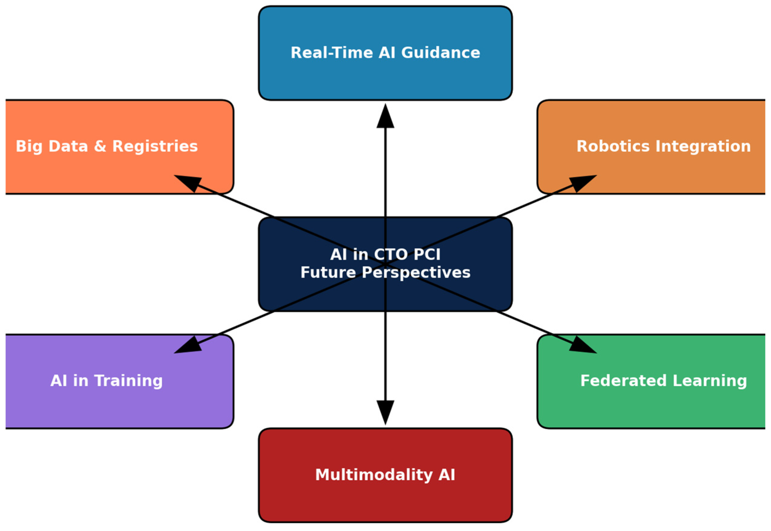 The trajectory of AI in CTO PCI aligns with future perspectives: real-time decision support, robotics integration, multimodal fusion, and federated learning. With international collaboration and regulatory safeguards, AI can evolve from retrospective analysis to real-world application, ultimately enhancing both procedural outcomes and long-term patient-centered care.
