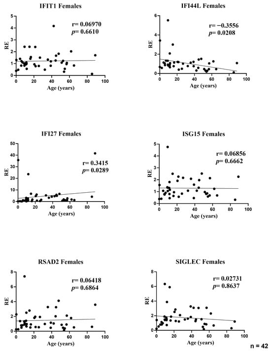 Correlations between age and relative expression (RE) of IFI27, IFI44L, IFIT1, ISG15, RSAD2, and SIGLEC1 in whole blood from female participants (n = 42). RE: relative expression. Circles represent individual subjects. Lines represent simple linear regressions fitted to untransformed data for visualization only. Statistical analysis: nonparametric Spearman correlation test. IFI44L decreased with age and IFI27 increased; the other ISGs showed no significant correlations.