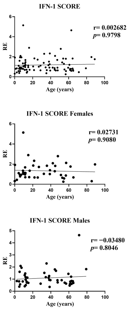 Correlations between age and the composite IFN-I score in whole blood from all participants (n = 95; females n = 42 and males n = 53). RE: relative expression. Circles represent individual subjects. Lines represent simple linear regressions fitted to untransformed data for visualization only. Statistical analysis: nonparametric Spearman correlation test. No significant age-related association was observed in any group.