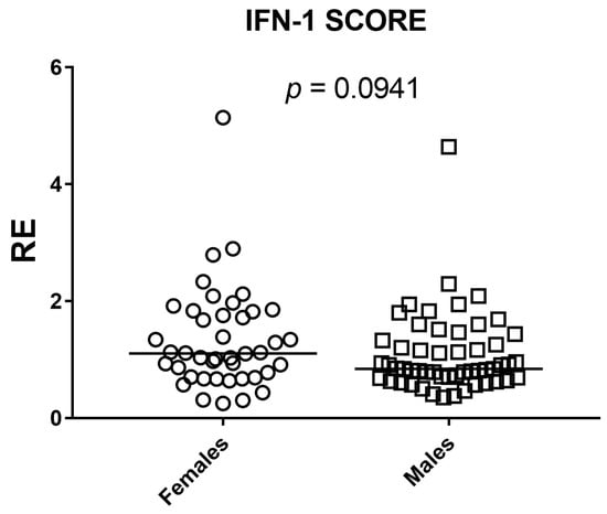 Sex comparison of the composite IFN-I score by two-sided Mann–Whitney U test. Scatter dot plot shows relative expression (RE) in females (n = 42) and males (n = 53); squares denote individual subjects and horizontal bars indicate medians. No significant between-sex difference was detected (p = 0.0941).