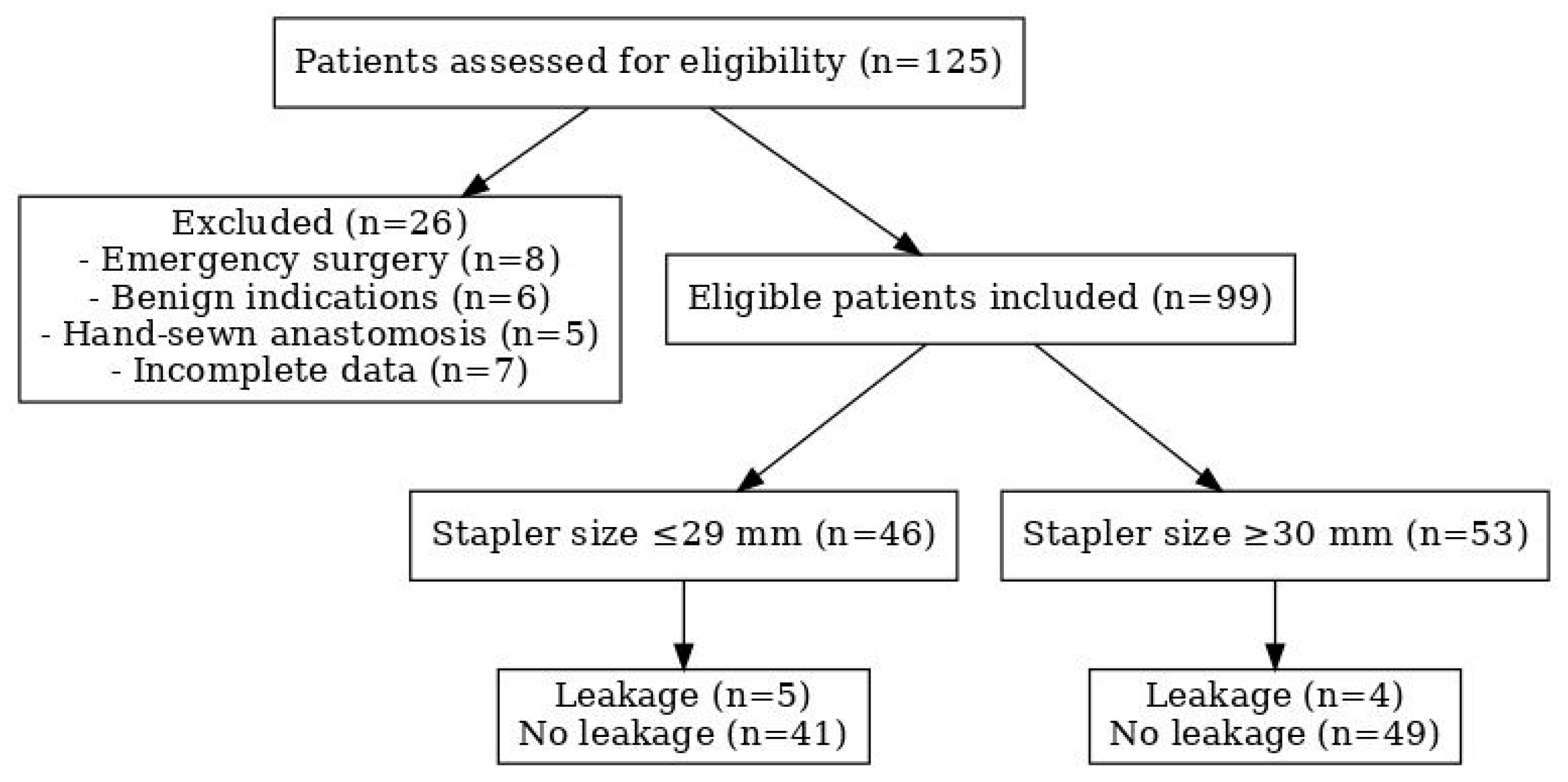 The cut-off for stapler size (≤29 mm vs. ≥30 mm) was selected based on previously published studies indicating a potential difference in leakage risk across these groups [