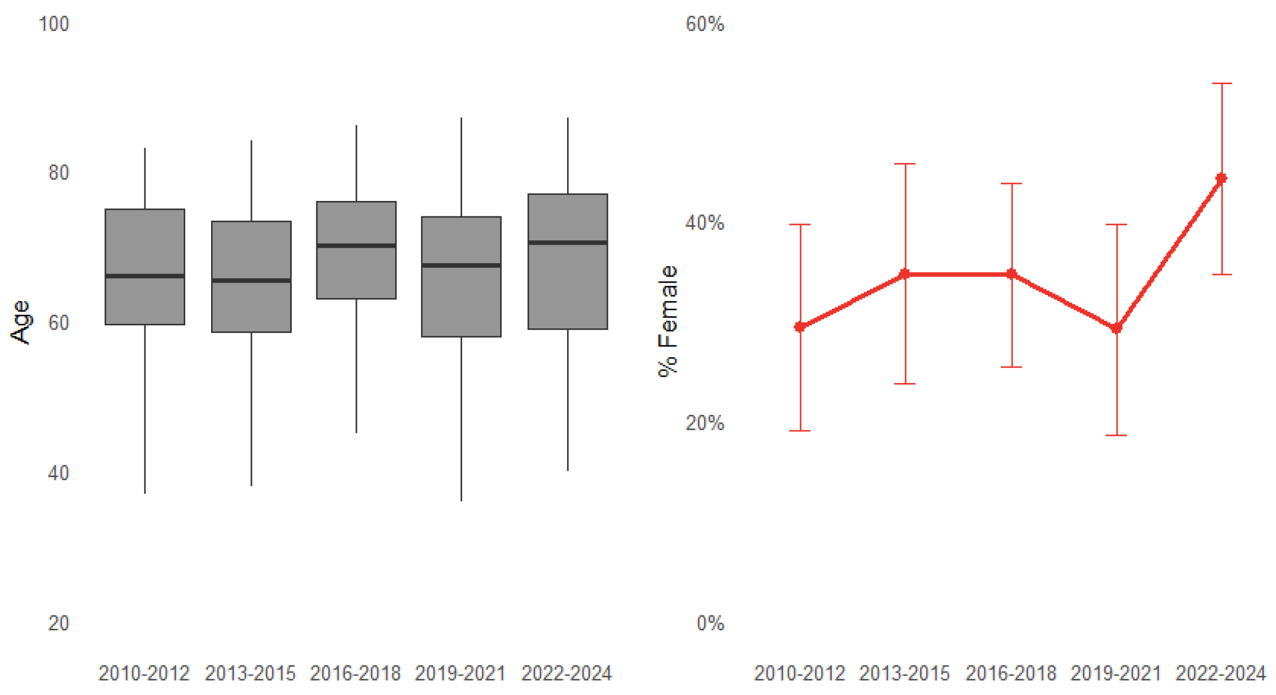 | Age, median (IQR) | 66 (60, 75) | 66 (59, 73) | 70 (63, 76) | 68 (58, 74) | 71 (59, 77) | 0.100 | 0.064 | ↑ |