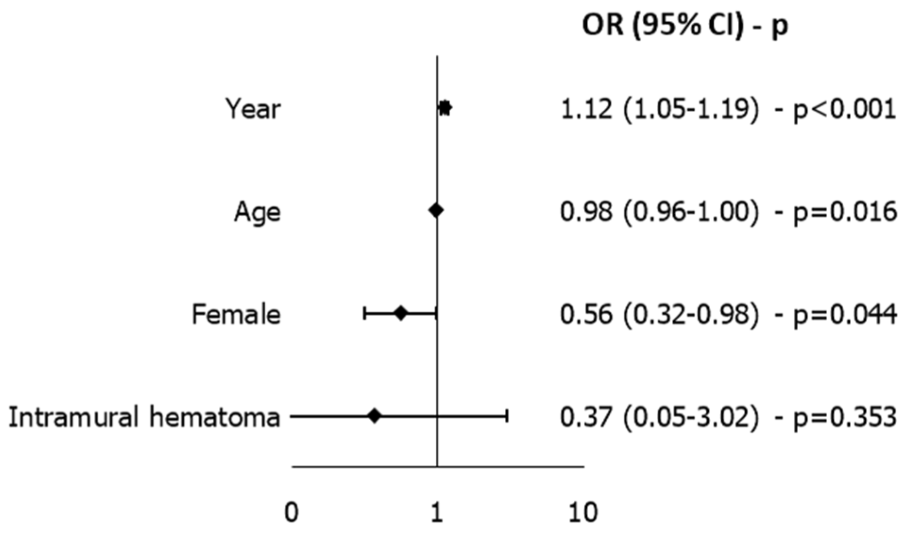 - Fialka, N.M.; Bozso, S.J.; El-Andari, R.; Kang, J.J.; O’Connell, A.; Moon, M.C.; Macarthur, R.; Nagendran, J. Sex differences in acute type A aortic dissection: A systematic review and meta-analysis. J. Cardiovasc. Surg. 2022, 63, 632–644. [Google Scholar] [CrossRef]