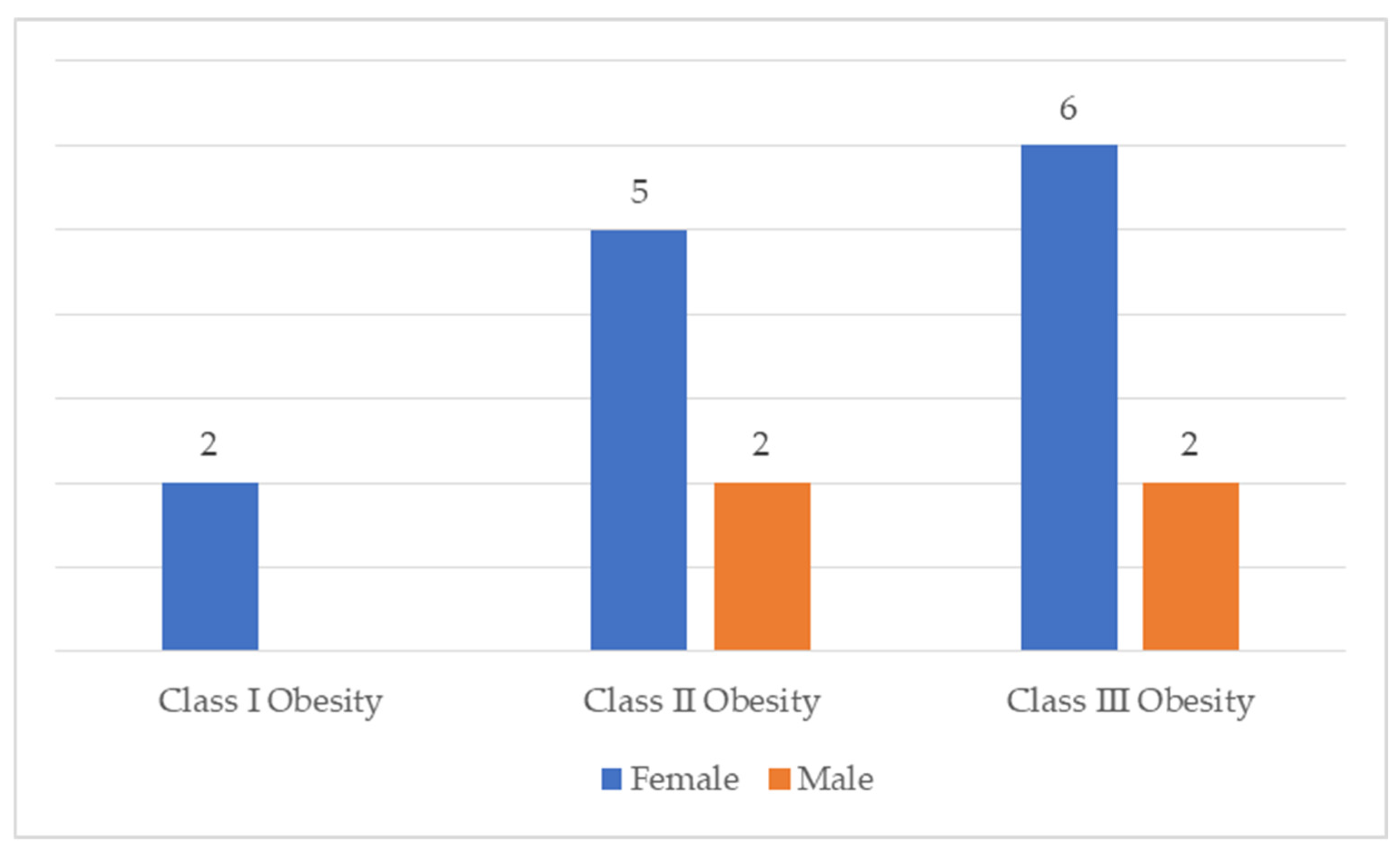 The participant with the least weight reduction (−7.0 kg) transitioned from class II to class I obesity six months after bariatric surgery. In contrast, the participant with the greatest weight reduction (−72.3 kg) moved from class III obesity to the overweight category. The maximum total weight loss (%TWL) was 40.39% of initial body weight, whereas the minimum %TWL was 7.07%. The maximum excess weight loss (%EWL) reached 107.75%, and the minimum %EWL was 22.78%.