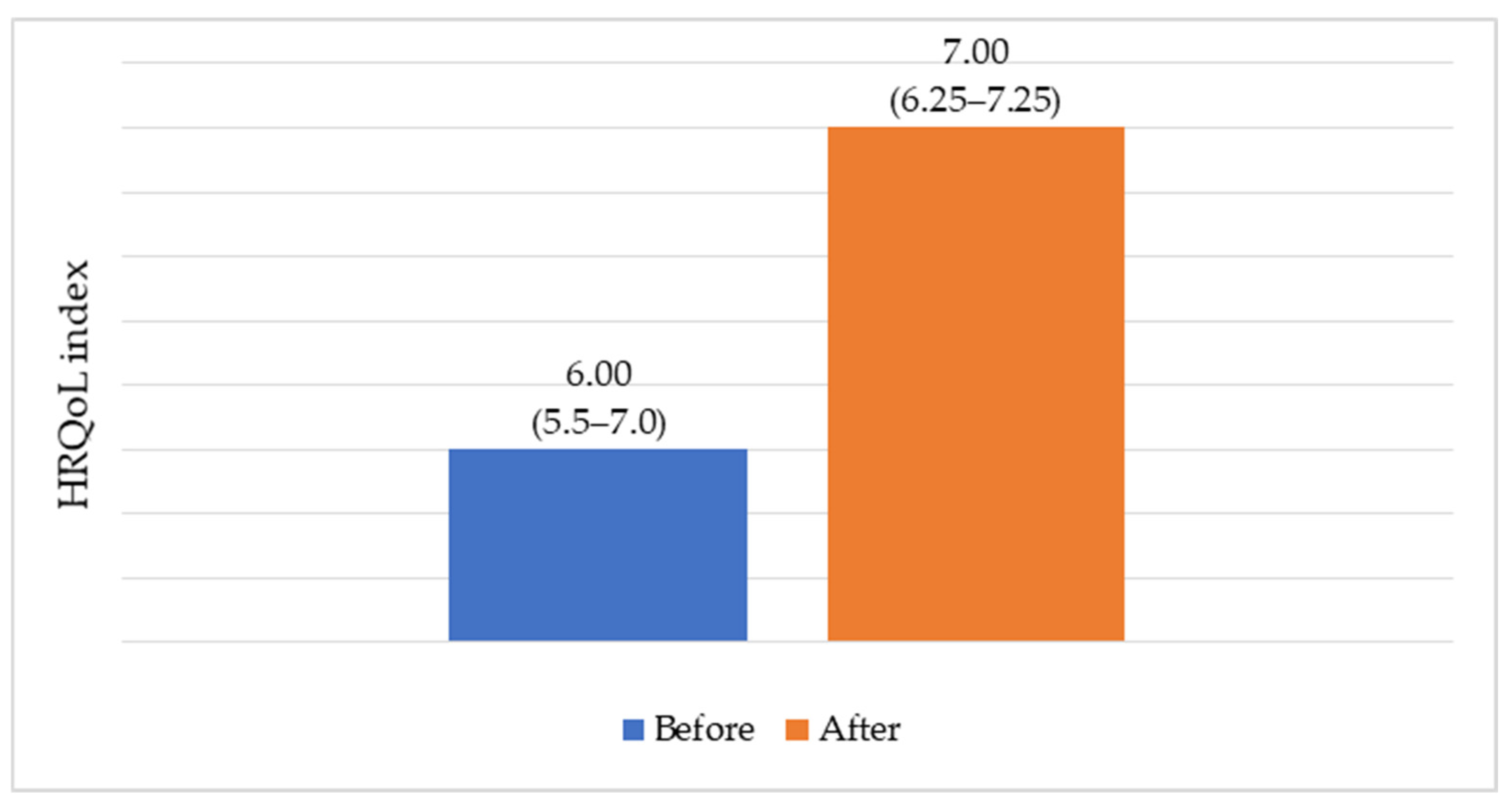p = 0.044), reaching a median score of 7 (IQR: 6.25–7.25). This median score was approximately 13%, below the maximum achievable HRQoL value of 8 points. Additionally, the minimum absolute HRQoL score improved by one point, increasing from 4.5 to 5.5. The highest observed values approached the upper range of the HRQoL scale. The changes in HRQoL before and after surgery are illustrated in