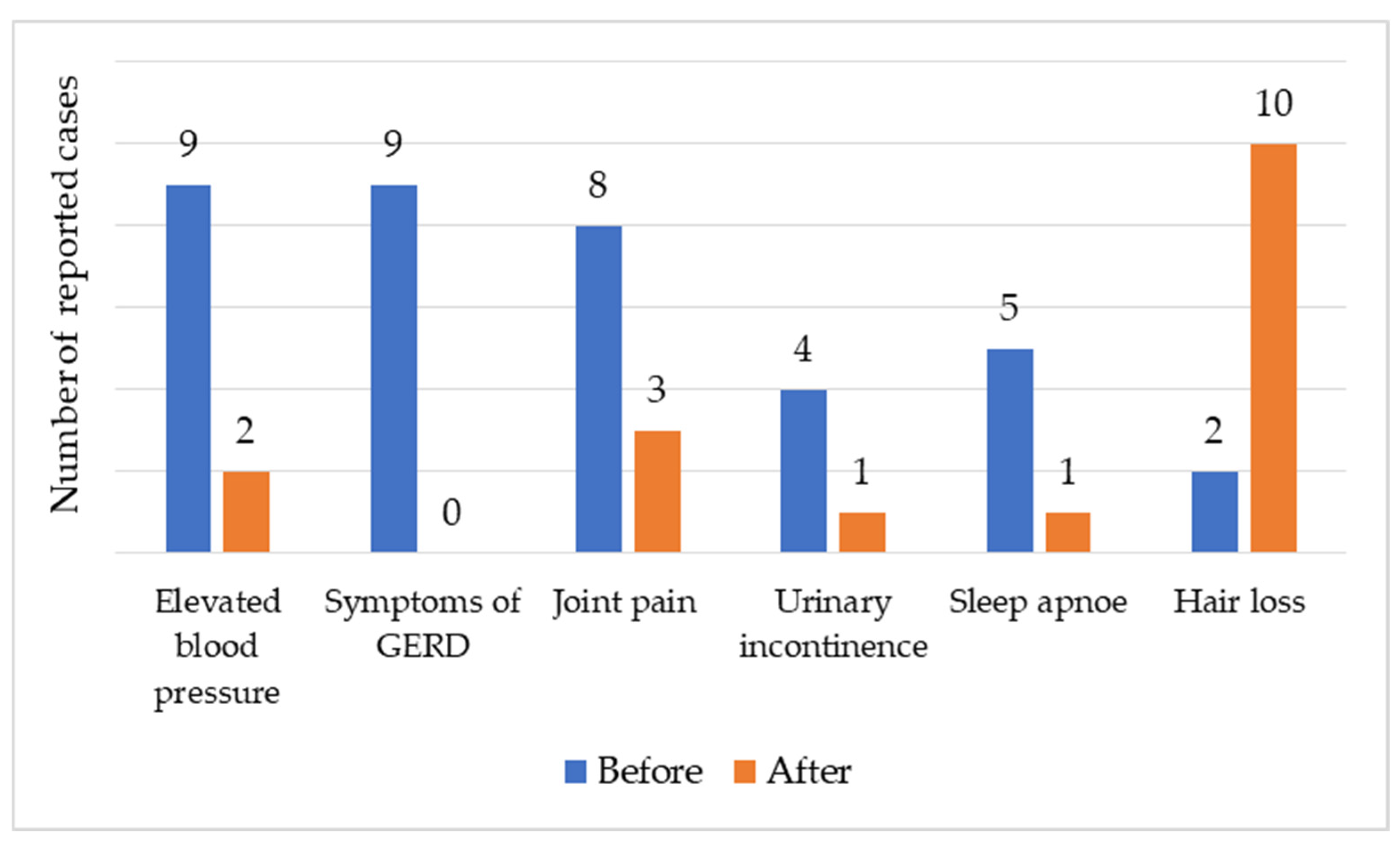 The most prevalent preoperative health conditions included: nine participants had hypertension, six experienced heartburn, three had acid reflux, eight reported joint pain, five had sleep apnoea, and four experienced urinary incontinence. Additionally, eight participants had gallstones, one had type 2 diabetes, and two reported preoperative hair loss. Ten participants reported regular use of medications, including eight for blood pressure management, two for pain relief, two for antidepressants, and one antidiabetic medication. Regarding weight loss prior to surgery, none of the participants reported weight reduction in the three months preceding the procedure.