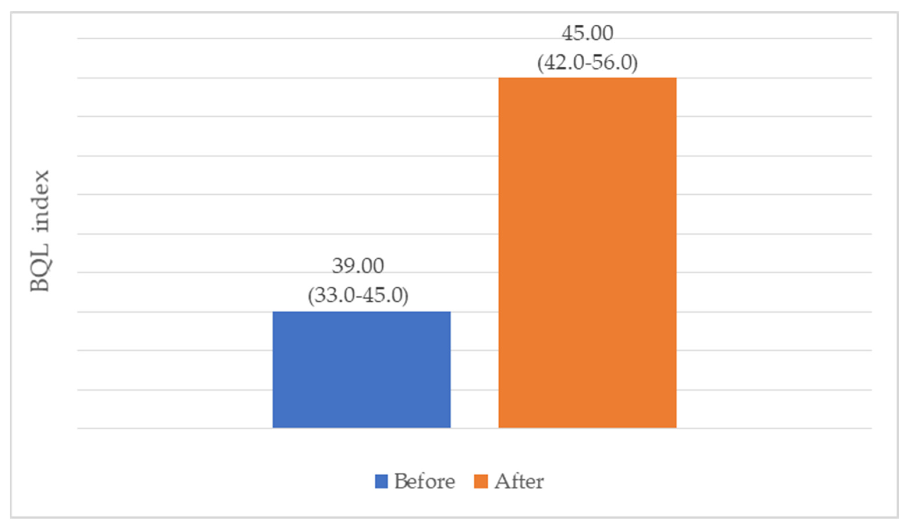 The second section of the questionnaire aims to assess the non-health-related QoL index. A comparison of the results before and six months after the procedure reveals a 15% increase in the BQL index, with a median value of 45 (IQR: 42–56) (