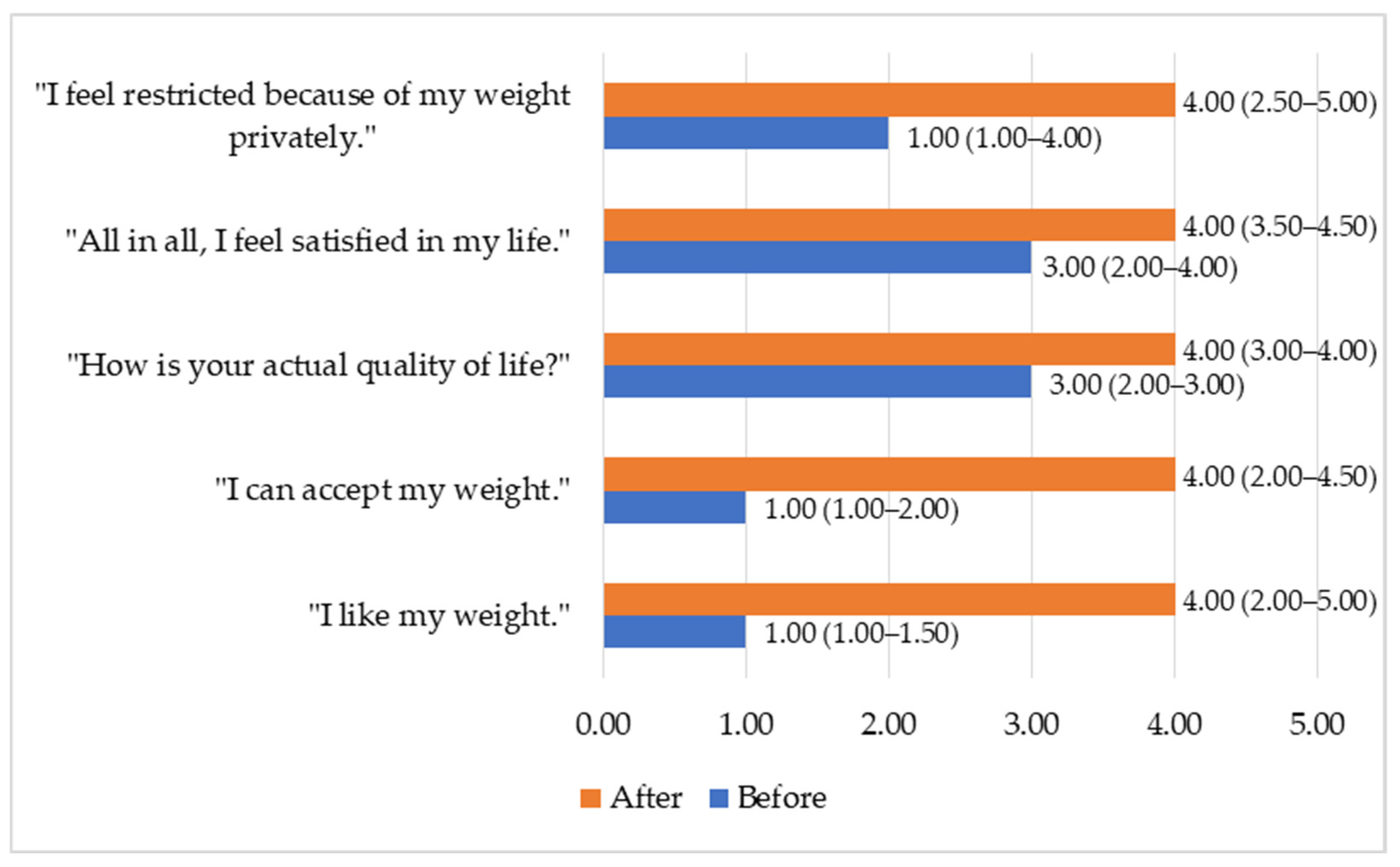 16]. These results are coherent with broader evidence that individuals with obesity frequently experience lower body image compared with the wider population, and that satisfaction with body weight tends to improve after substantial weight loss.