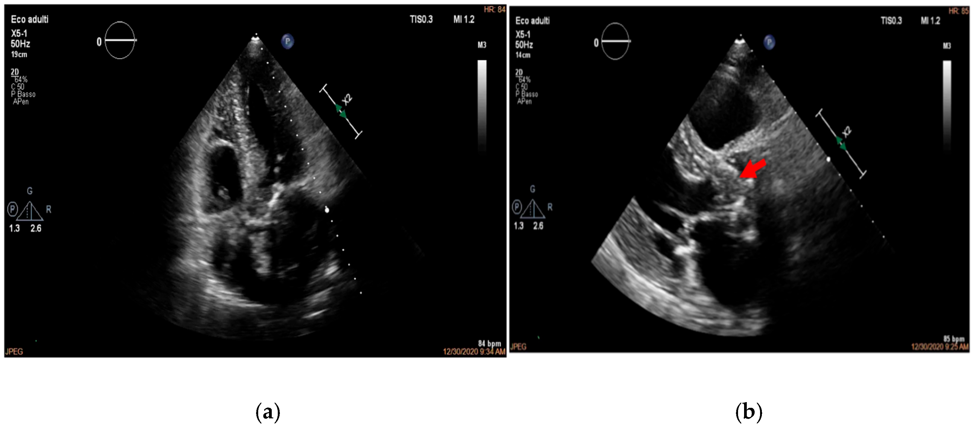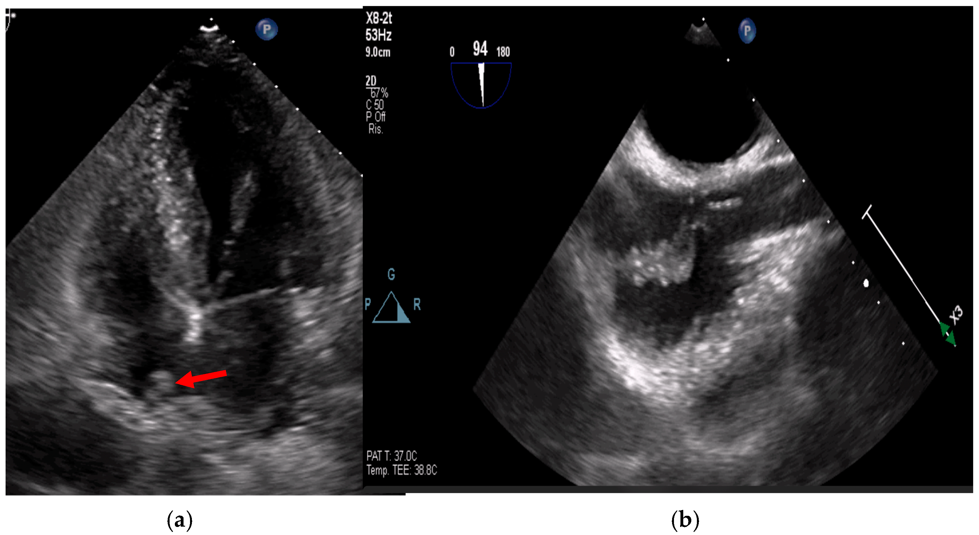 - Barton, T.L.; Mottram, P.M.; Stuart, R.L.; Cameron, J.D.; Moir, S. Transthoracic Echocardiography Is Still Useful in the Initial Evaluation of Patients with Suspected Infective Endocarditis: Evaluation of a Large Cohort at a Tertiary Referral Center. Mayo Clin. Proc. 2014, 89, 799–805. [Google Scholar] [CrossRef] [PubMed]