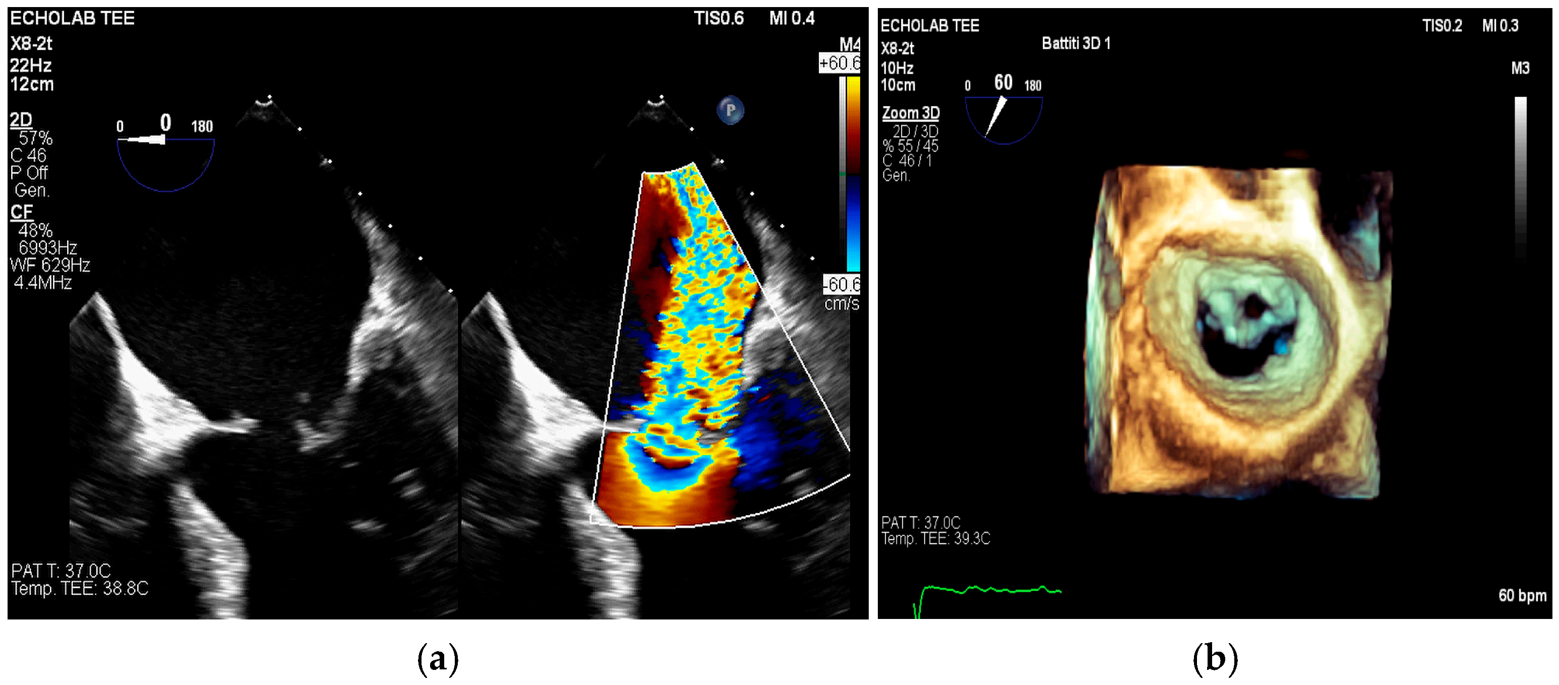 - Zoghbi, W.A.; Asch, F.M.; Bruce, C.; Gillam, L.D.; Grayburn, P.A.; Hahn, R.T. Guidelines for the Evaluation of Valvular Regurgitation After Percutaneous Valve Repair or Replacement. J. Am. Soc. Echocardiogr. 2019, 32, 431–475. [Google Scholar] [CrossRef]