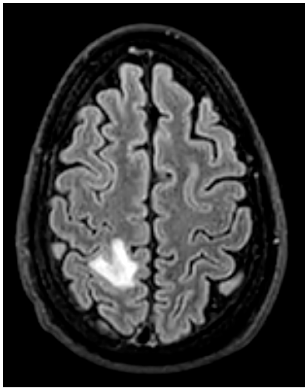 - Brain MRI is especially valuable for identifying clinically occult cerebral emboli, which can influence management decisions and prognosis [24,36] (Figure 15). These occur in 20–40% of IE cases, and a significant portion are clinically silent. Brain MRI with diffusion-weighted imaging (DWI) is the most sensitive modality for detecting acute cerebral infarcts, microabscesses, mycotic aneurysms, and hemorrhages [35,38]. Identifying these findings, even in asymptomatic patients, is critical as it can significantly influence surgical timing and risk stratification. The 2023 ESC guidelines recommend considering brain MRI before cardiac surgery in patients with IE, especially in those with neurological symptoms or high-risk clinical features [13]. For example, the presence of a large cerebral infarct, hemorrhagic lesions, or mycotic aneurysms may prompt delay of valve surgery to reduce the risk of perioperative neurological complications. Conversely, detection of small, non-hemorrhagic embolic lesions may support earlier surgery to prevent further embolization [30]. Prospective data demonstrate that routine cerebral MRI led to changes in surgical plans in up to 14% of cases, including both delays and accelerations of surgery based on neurological risk [39].