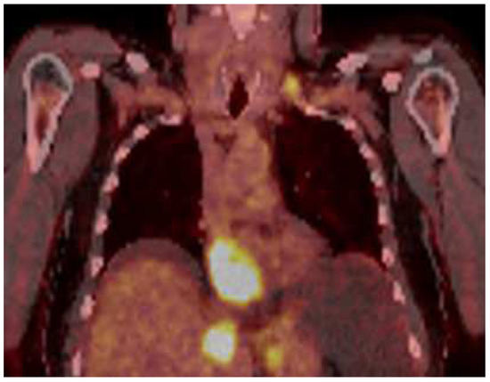 PET scan showed that there was a tumoral lesion with dimensions of 8.8 × 5.5 cm at the level of the right atrium with SUV max: 12.8.