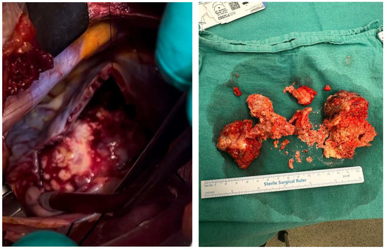 A combination regimen of pembrolizumab (200 mg IV every 3 weeks), trastuzumab (6 mg/kg IV every 3 weeks after an 8 mg/kg loading dose), and FOLFOX chemotherapy was initiated. The FOLFOX regimen comprised oxaliplatin (85 mg/m2), leucovorin (400 mg/m2 over 120 min), bolus 5-FU (400 mg/m2), and a continuous infusion of 5-FU (2400 mg/m2 over 46 h) every 2 weeks. However, trastuzumab could not be given due to cardiac pathology in the first cycle. Twelve cycles of chemotherapy were administered. Treatment with trastuzumab and pembrolizumab continued every 3 weeks until disease progression. Surgical excision was planned due to the lack of regression in the cardiac lesion during follow-up under treatment, the patient’s heart failure clinic and the risk of sudden death. A 10 × 7 cm mass, which completely filled the right atrium and extended to the tricuspid valve, adhering to the inferior vena cava, was resected during a surgical procedure performed in January 2024 (Figure 3).