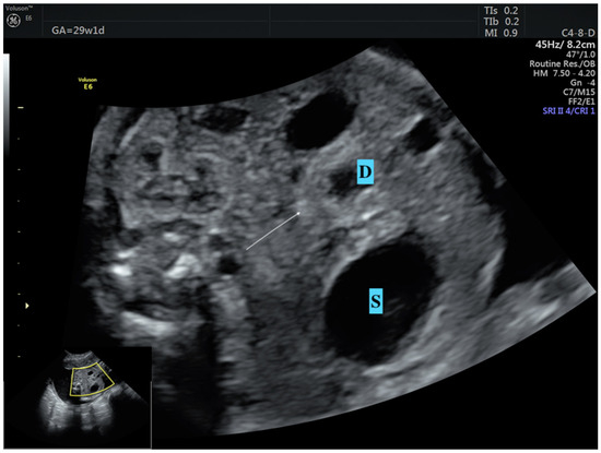 Diagnosing CDO is usually uncomplicated, aided by unique ultrasonographic characteristics and key signs, like the double bubble sign (Figure 1). A similar double bubble appearance seen during an ultrasound examination can result from a range of pathological conditions, such as intestinal duplications and several other factors [12]. At this point, it is crucial to confirm that the cystic formation, thought to be the duodenum, is actually connected to the stomach (Figure 1). Therefore, identifying the underlying cause of the duodenal obstruction prior to birth is extremely important. This differentiation is essential for assessing the prognosis and for planning suitable interventions for the postnatal period. Nevertheless, determining the underlying cause through imaging methods continues to be a challenging endeavor, even after birth [13,14]. A study reported 100% accuracy in diagnosing annular pancreas prenatally in the case of double bubble and hyperechogenic band surrounding the duodenum (Figure 2) [12]. Recently, Yin et al. reported 80% sensitivity and 97% specificity of pliers sign diagnosing annular pancreas in the prenatal period [15]. However, these findings have not been confirmed in another study [16]. Consequently, accurately identifying the differential diagnosis for the underlying causes of CDO in the uterus remains a considerable challenge and is usually performed by surgical interventions in the postnatal period.