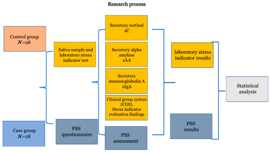The selection criteria for the case group were as follows: residence in of Kaunas city, aged 18–24 years, who needed to be in self-isolation due to COVID-19 not longer than 3 months before our testing was undertaken. The control group was composed of individuals of the same age but who had not undergone any type of isolation. The case and control groups consisted of 56 people, with 28 in each group. The structure of the study is presented in Figure 1. All participant data were de-personalized in the follow-up study, in accordance with ethical requirements and confidentiality.