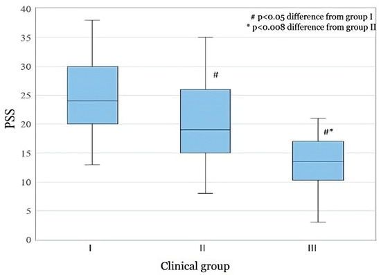 A comparison of the PSS scores (Figure 3) according to the interval-specific values, i.e., PSS scores (scores between 0 and 13 are considered low stress, scores between 14 and 26 are considered moderate stress; scores between 27 and 40 belong to high stress sequence) and a comparison of the scores obtained with the equivalent groups of CGS showed statistically significant differences between CGS I and CGS II and between CGS II and CGS III, with p ≤ 0.05. This assessment contributes to our observation that the two applied methodologies are complementary, i.e.,: in CGS group I, healthy or mild-moderate stress (PSS mean value 24.43); in CGS group II, moderate (PSS mean value 20.48) long-term stress with or without decompensation; and in CGS group III, predominantly somatic pathology, with the possible influence of medication, causes mild stress (PSS mean value 13.20). Graphical representation of the mean scores with data intervals shows a clear distribution of data (Figure 3).