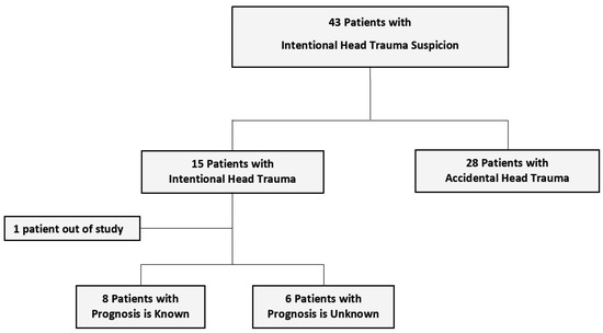 Of the 43 patients evaluated by the ACPU with a preliminary diagnosis of intentional head trauma (IHT), 15 patients (32.5%) were confirmed to have IHT. One patient was excluded from the study due to inaccessible file data (see Figure 1). Characteristics and outcomes of the sample are summarized in Table 2 and Table 3 and Figure 2, while Table 4 and Table 5 present the median values of developmental assessment standard scores and composite scores, respectively.