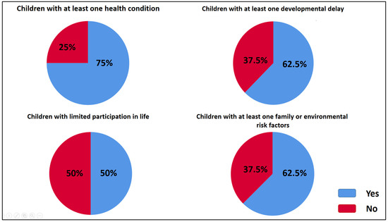Special education services: One child (12.5%) was benefiting from individual special education, speech and language therapy, and rehabilitation services. In contrast, one child (12.5%) resided in institutional care and had not received individual special education, speech and language therapy, and rehabilitation services since 2019 due to the COVID-19 pandemic.