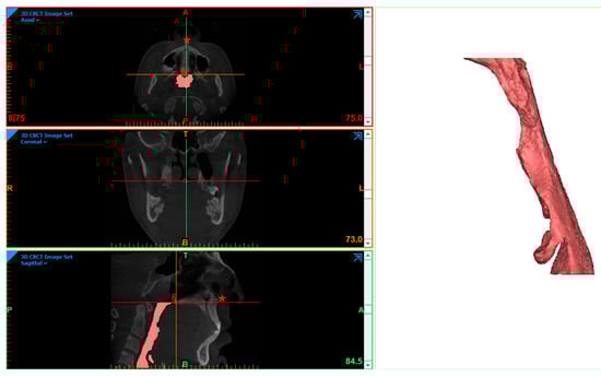 The evaluations of the posterior airway space of the oropharynx were performed using Mimics software (Materialise, Leuven, Belgium) by a single operator. The area of interest (airway space) was identified through manual thresholding with a range from −1024 to −650 Hounsfield Units (HU). Segmentation of the PAS was then performed by selecting, splitting, and cropping a mask on the mid-sagittal slices for the best alignment of the anterior nasal spine (ANS) and posterior nasal spine (PNS). The horizontal plane passing through the PNS was considered the superior border. The inferior border was a horizontal line in the mid-sagittal slice passing through the most inferior point of the hyoid bone. The lateral and posterior boundaries were represented by the pharyngeal walls and the anterior boundary, the soft palate, and the base of the tongue. The “Part” command allowed us to obtain the 3D object of the PAS (Figure 2), and the software automatically calculated the volume of interest in mm3 and the min-CSA in mm2.