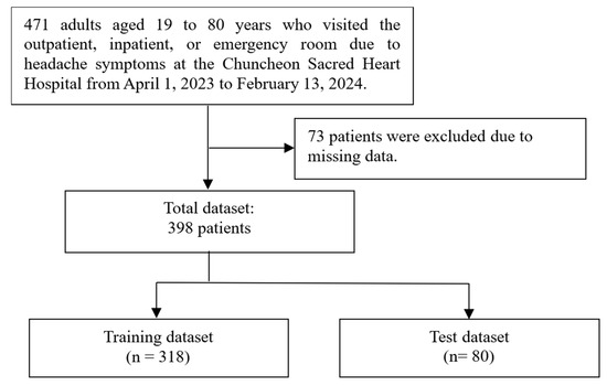 The initial dataset for this study consisted of 471 cases documented between 1 April 2023 and 13 February 2024. In total, 73 cases were excluded due to missing data, and a total of 398 cases were available for analysis. These cases were subsequently split into a training set (n = 318) and a test set (n = 80). The process is illustrated in Figure 2. Absolute standardized differences between the training set and test set exceeded 0.25 for head tingling, dizziness (as preceding symptoms), cold, and food (as trigger factors). Conversely, for other features, the ASD between the training set and test set remained below 0.25. The demographic and headache-related characteristics of both the training and test sets are summarized in Table 2.
