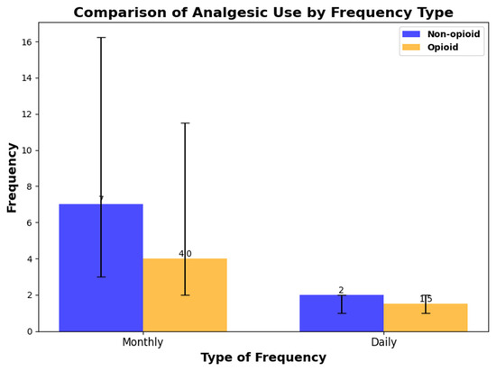 The monthly frequency and daily dose frequency of analgesic use among participants taking only non-opioid analgesics and those taking opioid analgesics.
