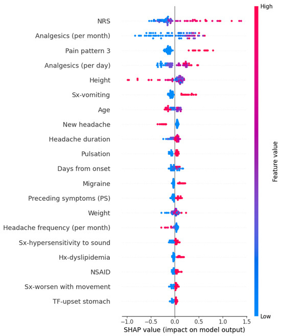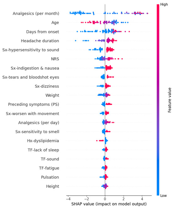 In the Random Forest model for predicting peak headache intensity, variables such as high frequency per month of analgesics, high intensity of usual headache, a course of increasing intensity, high frequency per day of analgesics, tall height, and others contributed to an increase in the prediction values. The detailed SHAP values of these features are summarized in Figure 8.