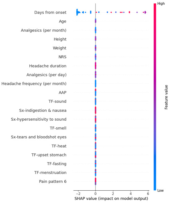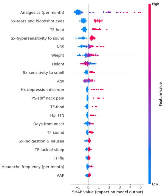 We calculated SHAP values for the models that exhibited the best performance for each target variable. In the Random Forest model for predicting HIT-6 scores, variables such as high frequency per month of analgesics, young age, long duration from onset, headache duration, hypersensitivity to sound, high intensity of usual headache, and others contributed positively to the prediction values. The detailed SHAP values of these features are summarized in Figure 4.